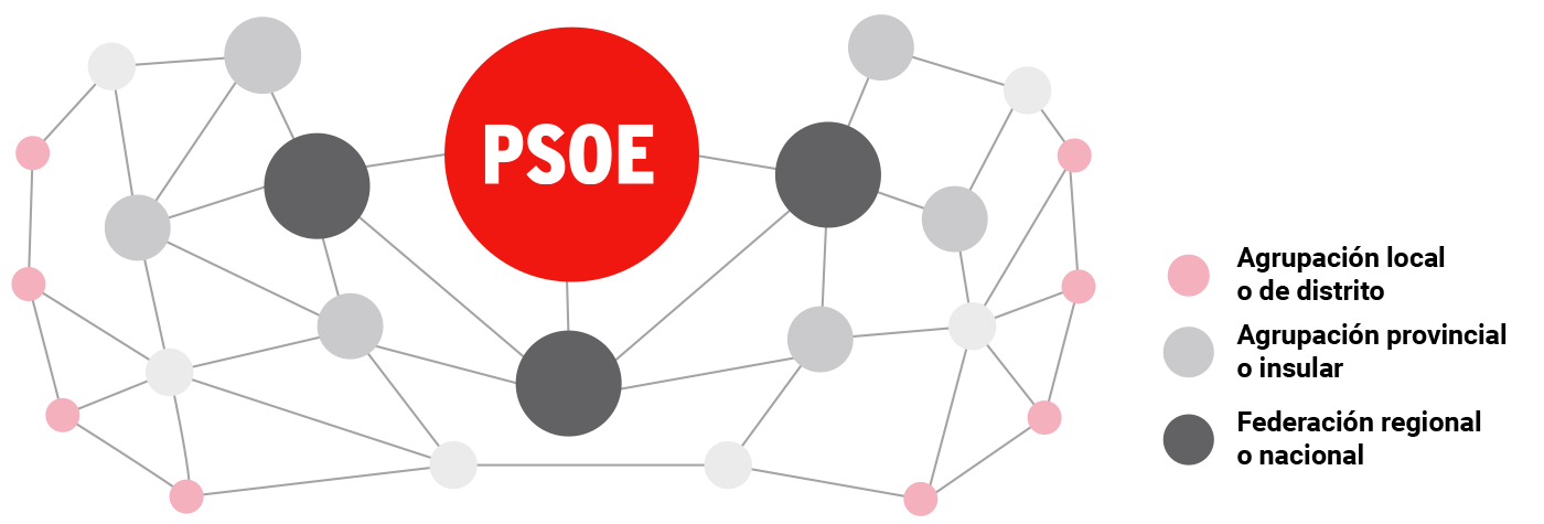 El PSOE es una organización política de carácter federal, constituido sobre la base de Agrupaciones Municipales y de Distrito, Provinciales o Insulares y estructurado en Partidos o Federaciones de Nacionalidad o Región.