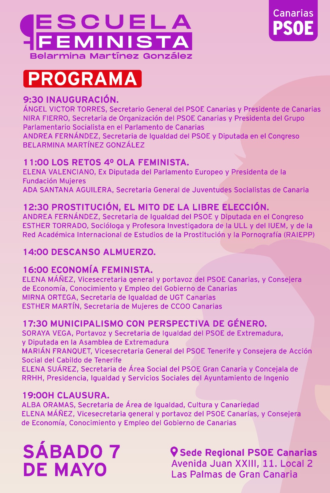 También participarán Esther Torrado, socióloga e investigadora de la ULL; Mirna Ortega y Esther Martín, secretarias de Igualdad y de la Mujer de UGT y Comisión Obreras Canarias, respectivamente; Elena Suárez, secretaria del Área Social del PSOE Gran Canaria y concejala de Ingenio; y de Alba Oramas, secretaria de Igualdad, Cultura y Canariedad del PSOE Canarias.